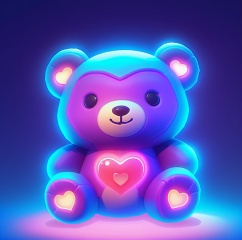 digital game illustration, teddy bear, glowing, neon colors, heart shapes, blue and purple hues, transparent effect, illuminated, digital art, cute style, soft edges, gradient background, glowing eyes, sitting position, stylized, love motif, centered composition, high-quality rendering, game asset ,<lora:游戏-000002:0.6>