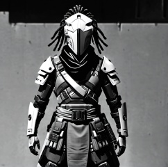weapon, sword, armor, helmet, greyscale, solo, monochrome, katana, sheath, sheathed, 1other, japanese armor, scarf, covered face, shoulder armor, humanoid robot, samurai, science fiction, cowboy shot, standing, cyberpunk, futuristic armor, robot helmet, LED visor, black and white, sci-fi, dystopian, mechanical glove, industrial background, armored gauntlets, dreadlocks, masked figure, augmented reality, cybernetic, arm plating, combat ready, metallic texture, digital art, high-contrast, urban warrior, cyber warrior, pose, cybernetic enhancements, robotic appearance, action figure. ,<lora:机甲-000002:0.6>