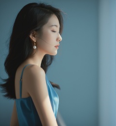 ,woman,Asian ethnicity,profile view,natural light,indoor setting,soft focus,moody,side lighting,contemplative expression,hair clip,blue dress,subtle makeup,young *****,serene,shadows,warm tones,1girl,solo,realistic,closed eyes,blurry,black hair,blurry background,closed mouth,photorealistic,lips,collarbone,upper body,portrait,depth of field,nose,<lora:15-000008:0.6>