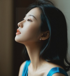 ,woman,Asian ethnicity,profile view,natural light,indoor setting,soft focus,moody,side lighting,contemplative expression,hair clip,blue dress,subtle makeup,young *****,serene,shadows,warm tones,1girl,solo,realistic,closed eyes,blurry,black hair,blurry background,closed mouth,photorealistic,lips,collarbone,upper body,portrait,depth of field,nose,<lora:15-000008:0.6>