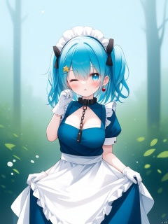 (masterpiece), (best quality), illustration, ultra detailed, hdr, Depth of field, (colorful),loli,[Artist:wlop],[[Artist:sheya]],Artist:hiten_(hitenkei),Artist rurudo, 1girl, solo, gloves, white gloves, one eye closed, maid headdress, apron, collar, breasts, short sleeves, dress, long hair, hair ornament, maid, blush, puffy sleeves, earrings, jewelry, blue eyes, medium breasts, puffy short sleeves, page number, collarbone, blue hair, parted lips, green dress, looking at viewer, chain, simple background, hand up, cleavage, white background, leash, hair between eyes, waist apron, crescent, frills, skirt hold, white apron, crescent hair ornament, blurry foreground, two side up