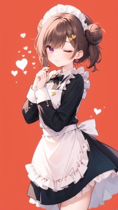 1girl, solo, heart hands, higuchi madoka, hair bun, mole under eye, brown hair, one eye closed, heart, maid, double bun, red background, purple eyes, mole, hair ornament, apron, earrings, maid headdress, looking at viewer, jewelry, simple background, alternate costume, maid apron, hairclip, enmaided, long sleeves, dress, black dress, white apron, nail polish, bangs, cross, frills