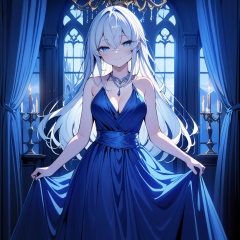 Noyu,line art,line style,1girl,solo,blue eyes,white hair,long hair,hair between eyes,cleavage,medium breasts,silver halter dress,necklace.halterneck,evening gown,cowboy shot,light smile,half-closed eyes,looking at viewer,skirt_hold,gothic architecture,Industrial wind,window_,sash,curtains,indoor,castle,chandelier,candlestand,masterpiece,bestquality,onnk