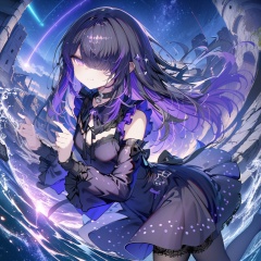 Noyu,sketch,starry sky,shooting star,ruins,water,1girl,(solo),Long hair,black hair,purple gradient hair,purple eyes,blunt bangs,hair over one eye,glowing eyes,small breasts,gothic,lace_trim,long sleeves,frilled shirt,skirt,choker,detached_sleeve,black pantyhose,(half-closed eyes),smug,close-up,upper body,looking back,masterpiece,bestquality,onnk,line art,line style,0,