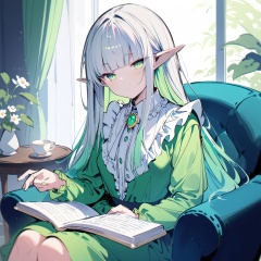 Noyu,sketch,1girl,elf,chibi,long hair,silver hair,green gradient hair,blunt bangs,green eyes,small breasts,green brooch,frilled shirt,long sleeves,dress,sitting,looking at viewer,half-closed eyes,holding book,window,curtains,plant,flower,book,teacup,chair,sofa,open book,paper,masterpiece,bestquality,onnk,line art,line style,Depth of field,(colorful),