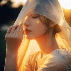 woman, close-up, ethereal, backlit, sheer fabric, Asian ethnicity, serene expression, sunset, warm color tone, golden hour, soft focus, hand on face, contemplative gaze, side profile, youthful, outdoor, natural light, delicate texture, fine art portrait, mystery, elegance, skin glow, fabric texture, hair under veil, nuanced lighting, bokeh background, shallow depth of field, ,<lora:14-000002:0.6>