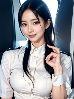 4girl, solo, looking at viewer, smile, short hair, simple background, shirt, black hair, white background, brown eyes, white shirt, upper body, teeth, collared shirt, grin, black eyes, lips, realistic, stewardess,multiplegirls