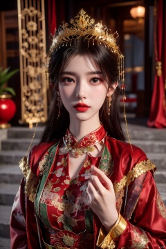 masterpiece,1girl,artist name,bangs,black eyes,black hair,chinese clothes,crown,floral print,gem,gold,jewelry,lips,lipstick,long hair,looking at viewer,makeup,red lips,solo,earrings,hair ornament,necklace,red dress,Red cloth shoes,indoor, traditional wedding, festive, wedding, ,Xlimuwan, hanfu,fengguanxiapei,Xchengling,Xyunxi, Yunxiao_Fairy
