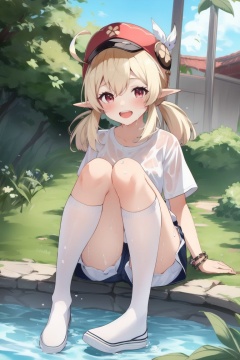 ((HRD, HUD, 8K)),((masterpiece, best quality)), highly detailed,Klee, klee (genshin impact), 1girl, shoes, shorts, pointy ears, pantyhose, blonde hair, shirt, feet, ahoge, solo, smile, twintails, white pantyhose, open mouth, white shirt, short sleeves, red eyes, sitting, looking at viewer, bangs, shoes removed, wet, low twintails, soles, bracelet, upper teeth only, wet clothes, toes, teeth, :d, hair between eyes, jewelry, dodoco (genshin impact), short shorts, white footwear, no shoes, wet shirt, see-through, white shorts, sidelocks, visor cap, foreshortening, red headwear, sneakers, foot focus, long hair, bottle, blush, alternate costume, legs, jumpy dumpty, <lora:20240702-1719916281946:0.7>