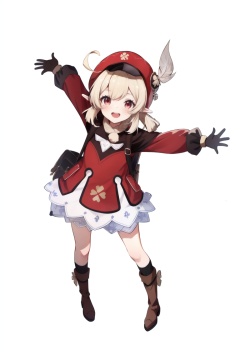 ((HRD, HUD, 8K)),((masterpiece, best quality)), highly detailed,Klee, 1girl, klee (genshin impact), solo, hat, gloves, blonde hair, boots, pointy ears, red headwear, white background, open mouth, bag, smile, red dress, dress, ahoge, twintails, backpack, brown gloves, brown footwear, full body, simple background, looking at viewer, dodoco (genshin impact), hat feather, outstretched arms, long sleeves, bloomers, bangs, feathers, long hair, underwear, red eyes, low twintails, :d, spread arms, socks, cabbie hat, <lora:20240702-1719916281946:0.7>