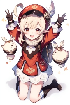 ((HRD, HUD, 8K)),((masterpiece, best quality)), highly detailed,Klee, 1girl, klee (genshin impact), solo, ahoge, hat, bangs, gloves, smile, sidelocks, twintails, boots, long hair, clover print, brown footwear, looking at viewer, brown scarf, pointy ears, long sleeves, :d, hat feather, brown gloves, low twintails, hair between eyes, backpack, dodoco (genshin impact), light brown hair, coat, bag, socks, pocket, bloomers, scarf, jumpy dumpty, open mouth, cabbie hat, arms up, knee boots, underwear, randoseru, red coat, red headwear, full body, simple background, kneehighs, hat ornament, white background, kneeling, orange eyes, charm (object), bag charm, red eyes, looking up, stuffed animal, stuffed toy, <lora:20240702-1719916281946:0.8>