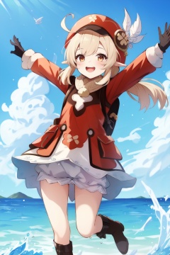 ((HRD, HUD, 8K)),((masterpiece, best quality)), highly detailed,Klee, 1girl, klee (genshin impact), hat, gloves, cabbie hat, pointy ears, smile, ahoge, twintails, pocket, solo, red coat, bangs, red headwear, hat feather, sidelocks, long sleeves, hair between eyes, looking at viewer, brown gloves, long hair, clover print, low twintails, :d, scarf, open mouth, coat, orange eyes, light brown hair, fish, hat ornament, brown scarf, sky, dodoco (genshin impact), blue sky, bag, depth of field, blurry, standing on one leg, jumpy dumpty, cloud, backpack, outstretched arms, bloomers, cloudy sky, ocean, spread arms, brown footwear, standing, underwear, randoseru, boots, horizon, splashing, water, <lora:20240702-1719916281946:0.8>