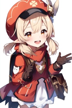 ((HRD, HUD, 8K)),((masterpiece, best quality)), highly detailed,Klee, 1girl, klee (genshin impact), hat, solo, bag, pointy ears, backpack, gloves, ahoge, smile, looking at viewer, v, bangs, twintails, low twintails, cabbie hat, long hair, long sleeves, red headwear, charm (object), sidelocks, dodoco (genshin impact), hat feather, bag charm, clover print, :d, brown gloves, scarf, open mouth, coat, red coat, randoseru, hat ornament, light brown hair, hair between eyes, red eyes, brown scarf, pocket, orange eyes, simple background, blonde hair, <lora:20240702-1719916281946:0.7>
