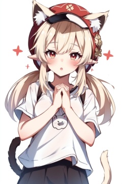 ((HRD, HUD, 8K)),((masterpiece, best quality)), highly detailed,Klee, 1girl, hat, animal ears, solo, cat ears, tail, cat tail, twintails, pointy ears, simple background, kemonomimi mode, white background, bangs, klee (genshin impact), red eyes, ahoge, long hair, low twintails, shirt, sidelocks, short sleeves, looking at viewer, hair between eyes, animal ear fluff, cat girl, sparkle, blush, light brown hair, alternate costume, blonde hair, t-shirt, :o, parted lips, open mouth, cowboy shot, clenched hands, <lora:20240702-1719916281946:0.7>