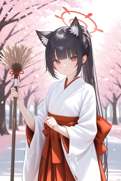 1girl, solo, looking at viewer, blush, smile, bangs, skirt, black hair, red eyes, long sleeves, holding, animal ears, ponytail, outdoors, japanese clothes, alternate costume, wide sleeves, kimono, blurry, petals, blurry background, halo, cherry blossoms, hakama, hakama skirt, extra ears, broom, miko, red hakama, holding broom