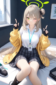 1girl, solo, long hair, breasts, looking at viewer, blush, smile, bangs, skirt, medium breasts, brown hair, shirt, gloves, long sleeves, sitting, very long hair, closed mouth, school uniform, green eyes, jacket, white shirt, pleated skirt, one eye closed, open clothes, shoes, black gloves, socks, collared shirt, fingerless gloves, black skirt, off shoulder, hair bun, open jacket, gun, sleeves past wrists, plaid, dress shirt, halo, plaid skirt, single hair bun, white footwear, black socks, sneakers, grey skirt, ;\), single side bun, yellow jacket, id card, nonomi \(blue archive\),nonomiBA,indoors