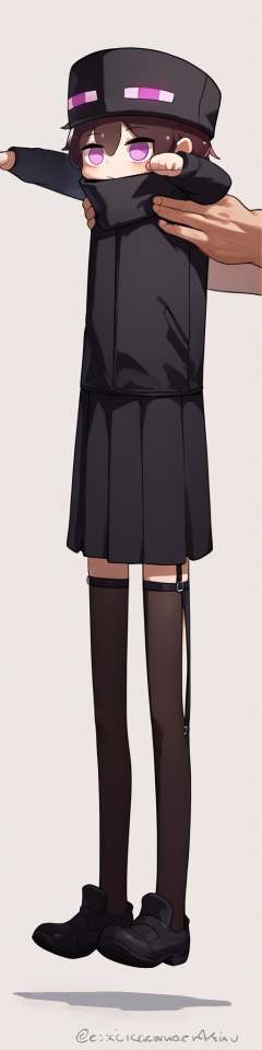 score_9, score_8_up, score_7_up, source_anime, IncrsXLLCM, full body, <lora:LongCatMeme_XLPD:1>, chibi, <lora:Enderman_XLPD:0.8> Enderman-chan, black jacket, high collar, enderman hat, black skirt, black thighhigh, garter straps, shoes,