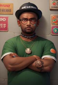 score_9, score_8_up, score_7_up, source_anime, 1boy, jewelry, sticker, hair ornament, hairclip, ear piercing, bandaid on face, ring, choker, necklace, bandaid on hand, tattoo, <lora:ArtstyleStickerV2_XLPD:1.25>, colorful, <lora:BigSmoke_XLPD:0.8> BigSmoke, black eyes, dark-skinned male, facial hair, glasses, black headwear, green shirt, crossed arms, fat,
