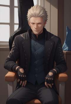 score_9, score_8_up, score_7_up, source_anime, 1boy, cowboy shot, instrument on back, instrument case, guitar case, <lora:InstrumentOnBack_XLPD:1>,  <lora:dmc5_vergil_ponyXL:1> dmc5vergil, black coat, fingerless gloves, pants, sitting, chair, plastic chair,