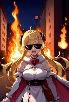 score_9, score_8_up, source_anime, 1girl, incrsxldealwithit, sunglasses, <lora:DealWithIt_XLPD:1.4>, <lora:last_1:1>, WatameBase, very long hair, ahoge, hairclip, fur-trimmed dress, short dress, red bowtie, detached sleeves, pouch, fur-trimmed cape, pink cape, happy, fire, burning building, street, night,