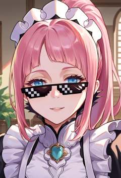 score_9, score_8_up, source_anime, 1girl, incrsxldealwithit, sunglasses, <lora:DealWithIt_XLPD:1>, <lora:felicia-fe-richy-v1_xl:0.8> feliciadef, pink hair, ponytail, blue eyes, maid headdress, brooch, maid apron, indoors, seductive smile,