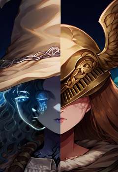 score_9, score_8_up, source_anime, <lora:Splitscreen_XLPD:0.6>, upper body, split screen, splitscreen, outdoors, night, BREAK <lora:Ranni_XLPD_CAME:1>, IncrsXLRanni, wavy hair, cracked skin, blue skin, colored skin, extra faces, white dress, witch hat, brown cloak, <lora:ExtraFaces_XLPD_CAME:0.5>,BREAK <lora:Malenia_XLPD:1> MaleniaDef, armor, cape, winged helmet, brown dress, covered eyes, helmet,