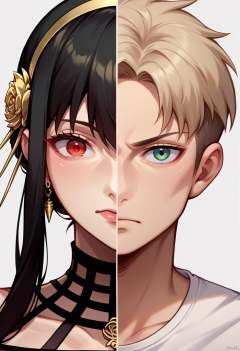 score_9, score_8_up, source_anime, <lora:Splitscreen_XLPD:0.6>, upper body, split screen, splitscreen,BREAK yor briar, red eyes, black dress, BREAK twilight \(spy x family\), 1boy,