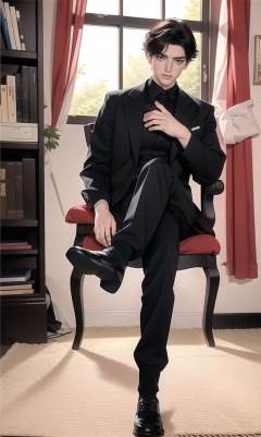 (Masterpiece:1.2), (best quality:1.2), (ultra high resolution:1.2), <lora:LovelyDoll3.0:0.65> male focus, solo, 1boy, chair, window, sitting, indoors, curtains, jewelry, crossed legs, book, jacket, pants, lamp, ring, shoes, short hair, black hair, long sleeves, white pants, socks, carpet, bookshelf, looking at viewer, full body, black footwear, black shirt, facial hair