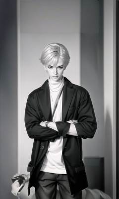 (Masterpiece:1.2), (best quality:1.2), (ultra high resolution:1.2), <lora:LovelyDoll3.0:0.65> greyscale, monochrome, solo, 1boy, male focus, crossed arms, ring, jewelry, turtleneck, coat, looking at viewer, short hair