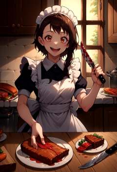 score_9, score_8_up, score_7_up, source_anime, 1girl, solo, OnoderaKosaki, <lora:OnoderaKosaki_XLPD:1>, maid, maid headdress, maid apron, kitchen, knife, food, smile, open mouth, steak, blood on knife,