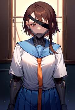score_9, score_8_up, score_7_up, source_anime, 1girl, solo, OnoderaKosaki, <lora:OnoderaKosaki_XLPD:1>, school uniform, serafuku, blue skirt, pleated skirt, blue sailor collar, white shirt, <lora:RaidenMGR_XLPD:0.9>, raidendef, bodysuit, cyborg, eyepatch, brown eyes,