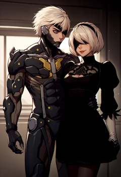 score_9, score_8_up, score_7_up, source_anime, standing, indoors, cowboy shot, looking at another, BREAK 1boy, RaidenMGRDef, <lora:RaidenMGR_XLPD-000006:1>, cyborg, bodysuit, eyepatch, expressionless, BREAK 2b \(nier:automata\), nier:automata, 1girl, blindfold, black dress, seductive smile,