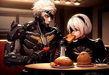 score_9, score_8_up, score_7_up, source_anime, standing, indoors, upper body, looking at another, table, restaurant, kfc, chicken \(food\), BREAK 1boy, RaidenMGRDef, <lora:RaidenMGR_XLPD-000006:1>, cyborg, bodysuit, eyepatch, expressionless, BREAK 2b \(nier:automata\), nier:automata, 1girl, blindfold, black dress, eating,