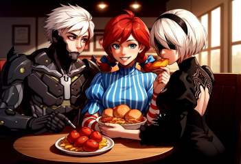 score_9, score_8_up, score_7_up, source_anime, indoors, upper body, table, restaurant, kfc, chicken \(food\), sitting, 3people,BREAK 1boy, RaidenMGRDef, <lora:RaidenMGR_XLPD-000006:1>, cyborg, bodysuit, eyepatch, expressionless, BREAK wendy \(wendy's\), wendy's, happy, seductive smile, 2girls, BREAK 2b \(nier:automata\), nier:automata, 2girls, blindfold, black dress, eating,