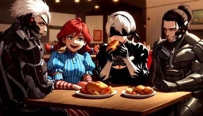 score_9, score_8_up, score_7_up, source_anime, indoors, table, restaurant, kfc, chicken \(food\), sitting, 4people, around table,BREAK 1boy, RaidenMGRDef, <lora:RaidenMGR_XLPD-000006:1>, cyborg, bodysuit, eyepatch, expressionless, white hair, BREAK wendy \(wendy's\), wendy's, happy, seductive smile, 1girl, red hair, BREAK 2b \(nier:automata\), nier:automata, 1girl, blindfold, black dress, eating, white hair, large breasts, BREAK 1boy, JetstreamSam, headgear, cyborg, bodysuit, beard, <lora:JetstreamSam_XLPD:0.85>, smirk, laughing,