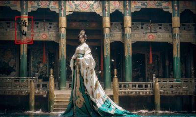 Dark and majestic Chinese palace background at night, waves and swirls of emerald color, a beautiful girl standing in the palace, the center of the sea, traditional Chinese costume jewelry,elaborate costumes, full body photos, traditional costumes, eye - catching details, the best quality,<lora:绪儿-皇宫palace background:0.9>