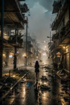 (masterpiece, best quality, highres, high result) masterpiece, best quality 8ka small city in which only a small area has not fallen into disrepair and decay. Around this area there are improvised fences made of metal. The region is rainy and very gloomyThe view is from a bird's perspective it rains and its darkthe city is from austriait's the apocalypseit's all very overgrown(post-apocalypse, rubble, street, 1girl, light particles, dust particles, haze, dust, overgrown, solo, :1.3) (rambo, plants, jungle, facing away, walking away, full body, cityscape, skyline, distant, ) <<lora:more_details:0.3>, ,Photorealistic, Hyperrealistic, Hyperdetailed, analog style, detailed skin, matte skin, soft lighting, subsurface scattering, realistic, heavy shadow, masterpiece, best quality, ultra realistic, 8k, golden ratio, Intricate, High Detail,