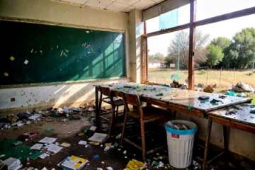 RAW photo,subject,8k uhd,dslr,soft lighting,high quality,film grain,Fujifilm XT3,,,ruanyi0056,book,book stack,bottle,box,broken,broken glass,broken window,bucket,cardboard box,chair,chalkboard,classroom,curtains,debris,desk,glass,grass,indoors,messy room,ruins,school,school desk,shelf,table,trash can,wall,water,dirty,reflection,dirt,dust,no humans,<lora:detail_slider_v4:1>,<lora:0056 abandoned school_v2:1>