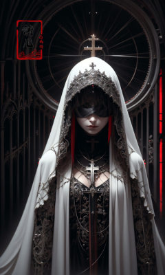 the goddess by shadrach jaroshelev, in the style of gothic futurism, dark white and light red, hyper-detailed illustrations, uhd image, Gorgeous costume details, intricate costumes, (cathedral:1.6),(beautiful and clear background:1.4),(Transparent blindfold:1.1),  (coif:1.3),<lora:绪儿-修女头巾coif:0.9>