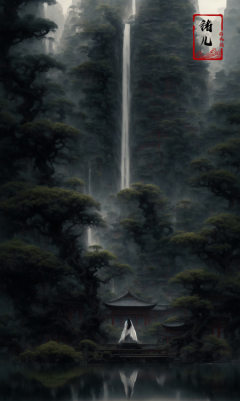 an painting in a style of oriental painting, in the style of matte painting, layered and atmospheric landscapes, rich and immersive, quiet contemplation, dark white and green, history painting, zen-inspired, grandeur of scale,highly detailed, dynamic, cinematic, stunning, realistic lighting and shading, vivid, vibrant, 8k,octane render, unreal engine, very detailed, concept art, realistic, Cry engine, wide shot,very long hair,white hair,east asian architecture,building,pagoda,scenery,pine,tree,outdoors,bridge,water,reflection,fog,boat,pond,moss,<lora:绪儿-松pine:0.9>