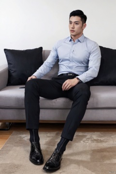 jzns,1man,asian,handsome,shirt,black glossy socks,bulge,muscular,sitting,model pose,couch,full body,(masterpiece,realistic,best quality,highly detailed,highres,colorful),jmsw,