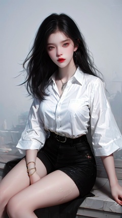 1girl, solo, black hair, long hair, shorts, sitting, looking at viewer, shirt, realistic, white shirt
