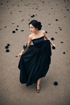 (masterpiece,best quality,ultra-detailed, absurdres),((film still,movie still)),photograph,volumetric lighting,Slow Shutter Speed,Primitivism,RAW photo,ultra-sharp focus,internationally-acclaimed photograph,ambient atmosphere,ambient,pale complexion,film grain texture,analog photography aesthetic,visual storytelling,dynamic composition,high gloss,extremely beautiful skin,natural skin texture,(shiny skin:1.4),1girl,huge skirt,black dress,everywhere black roses,black rose,flowers,black flowers,the black cloud,exterior,depth of field,top view angle,stunning textures.,