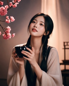 a chinese girl among flowers,beard,((open arms)),hold up his head,drinking from a small black porcelain cup,bold crazy excited passionate expression,laughing,((opened black cloth)),from below,detailed face,c,warm tone,afternoon,ethereal atmosphere,evocative hues,captivating coloration,dramatic lighting,enchanting aura,masterpiece,best quality,epic cinematic,soft nature lights,rim light,amazing,hyper detailed,ultra realistic,soft colors,photorealistic,Ray tracing,Cinematic Light,light source contrast,ananmo,ink paniting,traditional chinese ink painting,
