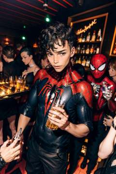 Bar photo,1boy,depth of field,best qualtiy,masterpiece,movie-level quality,<lora:20240115-1705331714218-0020:0.7>,many people,drink,Spiderman,<lora:add_detail:0.5>,marvel heroes,holding champagne in hand,spider man tight,boy focus,