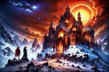best qualtiy,masterpiece,movie-level quality,castle,<lora:20240317-1710689677412-0008:0.8>,snow mountain,horizon,iceberg,bonfire,fantasy,the top of the hill,a mountainous horizon,say,scenery,night,stars,galaxy,red moon,