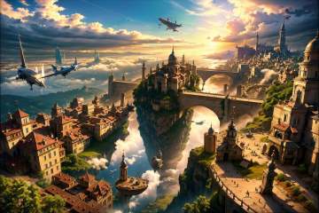 best qualtiy,masterpiece,movie-level quality,castle,<lora:20240317-1710689677412-0008:0.7>,aircraft,bridge,fantasy,city,a floating city in the air,