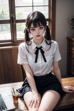 masterpiece,ultra high res,realistic,finely detail,extremely detailed,1girl,solo,skirt,chair,sitting,shirt,low twintails,long hair,looking at viewer,short sleeves,indoors,white shirt,brown hair,realistic,bangs,blurry,black skirt,ribbon,blurry background,blue ribbon,brown eyes,on chair,blunt bangs,hand on own knee,collared shirt,pencil skirt,depth of field,table,desktop,<lora:add_detail:0.5>,