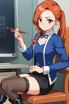 HDR,UHD,best quality,Highly detailed,masterpiece,Professional,<lora:琥嘉:0.6>,hj,1girl,solo,orange hair,long hair,smile,skirt,thighhighs,long sleeves,twintails,jacket,braid,boots,black thighhighs,miniskirt,black skirt,twin braids,zettai ryouiki,knee boots,pencil skirt,sitting,on chair,
