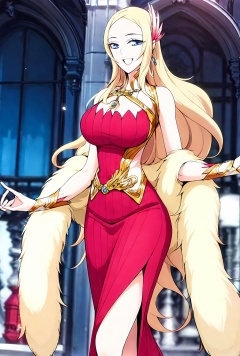 HDR,UHD,best quality,Highly detailed,masterpiece,Professional,<lora:yafei(meinahentai_v4):1>,yafei,1girl,blonde hair,long hair,dress,solo,jewelry,smile,hair ornament,open mouth,breasts,red dress,earrings,day,bare shoulders,large breasts,bracelet,